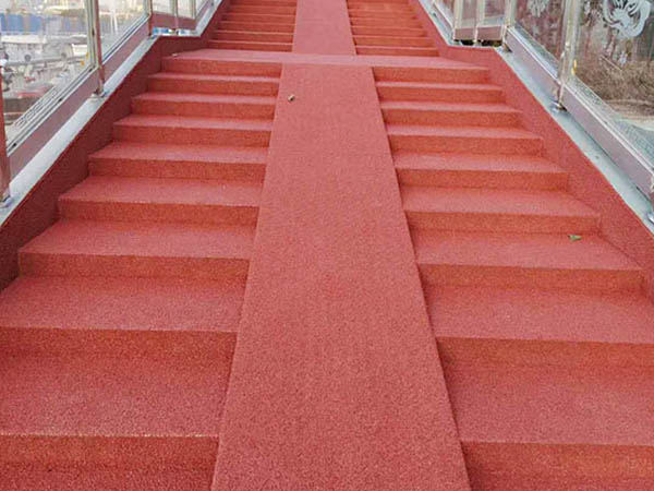 6.將符合要求的干凈彩色防滑骨料均勻地涂在膠粘劑上,使膠粘劑完全覆蓋骨料,兩者充分結(jié)合,骨料密實光滑。小心不要弄平或溢出。及時取下膠帶,以確保彩色路面的邊緣沒有損壞。如果路面損壞,應(yīng)及時使用原材料修補(bǔ)。